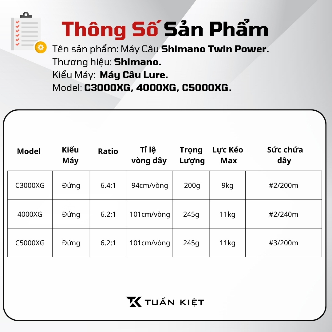 Size | Vòng Tua | Trọng Lượng (g) | Lực Kéo (kg) | Thu Dây | Chứa Dây | Sản Xuất |